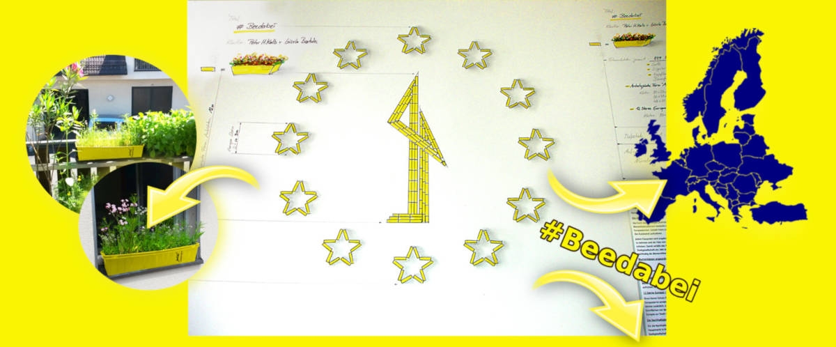 227 gelbe Blumenkästen möchte er mit dem #Beedabei Schild versehen und auf dem Hauptmarkt in Nürnberg aufstellen. Dabei sind die Blumenkästen so aufzustellen, dass sie den Archetyp „Aufrichten“ und die Europasterne darstellen. Nachdem es die ersten Fotos des Kunstprojektes gibt, löst es sich langsam auf.